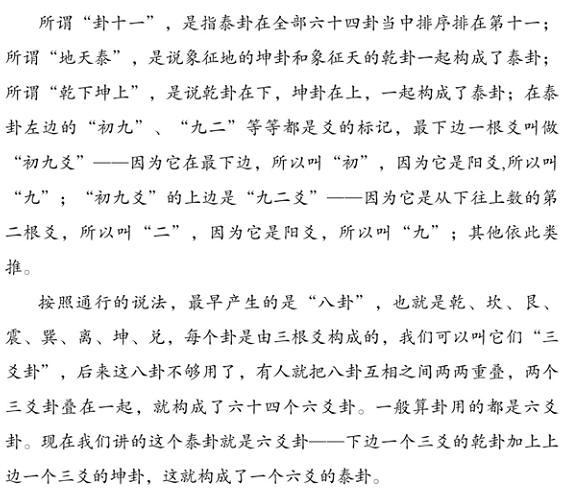 这个卦是六十四卦系统中的泰卦。泰卦是由八卦系统中的乾卦和坤卦组合成的,乾在下,坤在上。历来对泰卦的经典解释是:乾象征天,坤象征地;乾在下意味着天往下跑,坤在上意味着地往上蹿,于是乎天地相交,大吉大利。