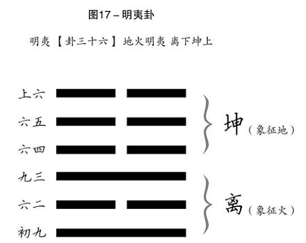 其实这真是错怪人家了,“明夷”不能拆开来读,这个词和“夷狄”没有一点儿关系,它是《周易》里的一个卦名,卦像是:内卦是离卦,外卦是坤卦。我们已经知道了离象征火,放到这个例子里它又象征太阳,我们也知道坤象征土地,这里没变,还是象征土地,联系起来看就是:太阳在土地的下边。