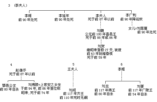 在公元前104至前101年率军远征中亚、后来投降匈奴的将领李广利是李夫人之兄;李夫人死于公元前87年的某个时期;她的另一兄长李延年曾任协律都尉,负责宫廷的乐曲演奏。她的孙子刘贺在公元前74年昭帝死后在位27天。昭帝本人是武帝另一个姓赵的妃子之子;不同寻常的是,她的家族似乎没有卷入政治,公元前87年,她的儿子被选为武帝继承人,这事可能部分地是由于她没有任何亲戚在朝廷担任高官。武帝其他后妃所生的三个儿子为帝国内三国之王;其中的燕王刘丹两次企图夺取皇位,在第二次失败时丧了命(公元前80年)。