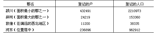 到了前汉后期,郡的数量增加到83个,原因是政府接管了王国的领地,把大郡划分为小郡,和把势力伸入中亚和其他新领土之中。按已掌握的下一个行政单位的表格,公元140年共有80个郡。[3] 郡的大小不论在面积上和人口上,都相差很大。公元1—2年的统计提出了几个有代表性的郡的数字,见表11。