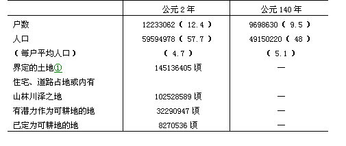 人口与土地的登记是由于税收和征集人力服劳役的需要。最低一级政府每年编人口和土地的登记数并将报告上交其上级,最后由帝国的郡和国算出总数。正史中恰当地以概括的形式收了公元2年和公元140年的两次统计数,它们提供了在每个郡登记的户数和人数;遗憾的是土地数字只给了总数,内容是丈量的全部土地面积,有潜力的可耕地面积和实际上已耕种的土地。在地方一级官员统计过程中,这些数字很可能远为详细,比如包括每户成员的年龄、性别和身份,这样才能确定何人应纳人头税和服劳役;还包括调查的土地的质量,这样才能确定土地税的适当税率。[5]