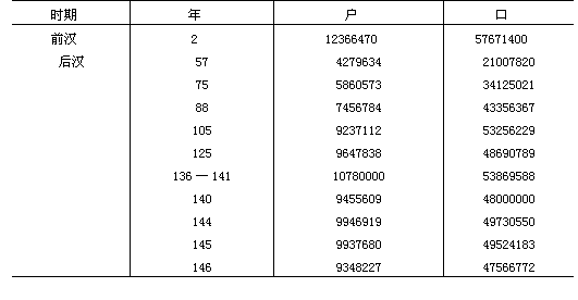 [11] 上表的公元2年和140年的人口数字的材料,分别见于《汉书》卷二八下,第1640页和《后汉书·志》卷二三,第3533页。其他年的数字,取自《后汉书·志》卷二三,第3534页的注释。这些数字依据不同的资料,它们不一定都有详细说明。公元2年和140年的数字根据毕汉斯的《人口统计》第58—59页的材料进行了更正。